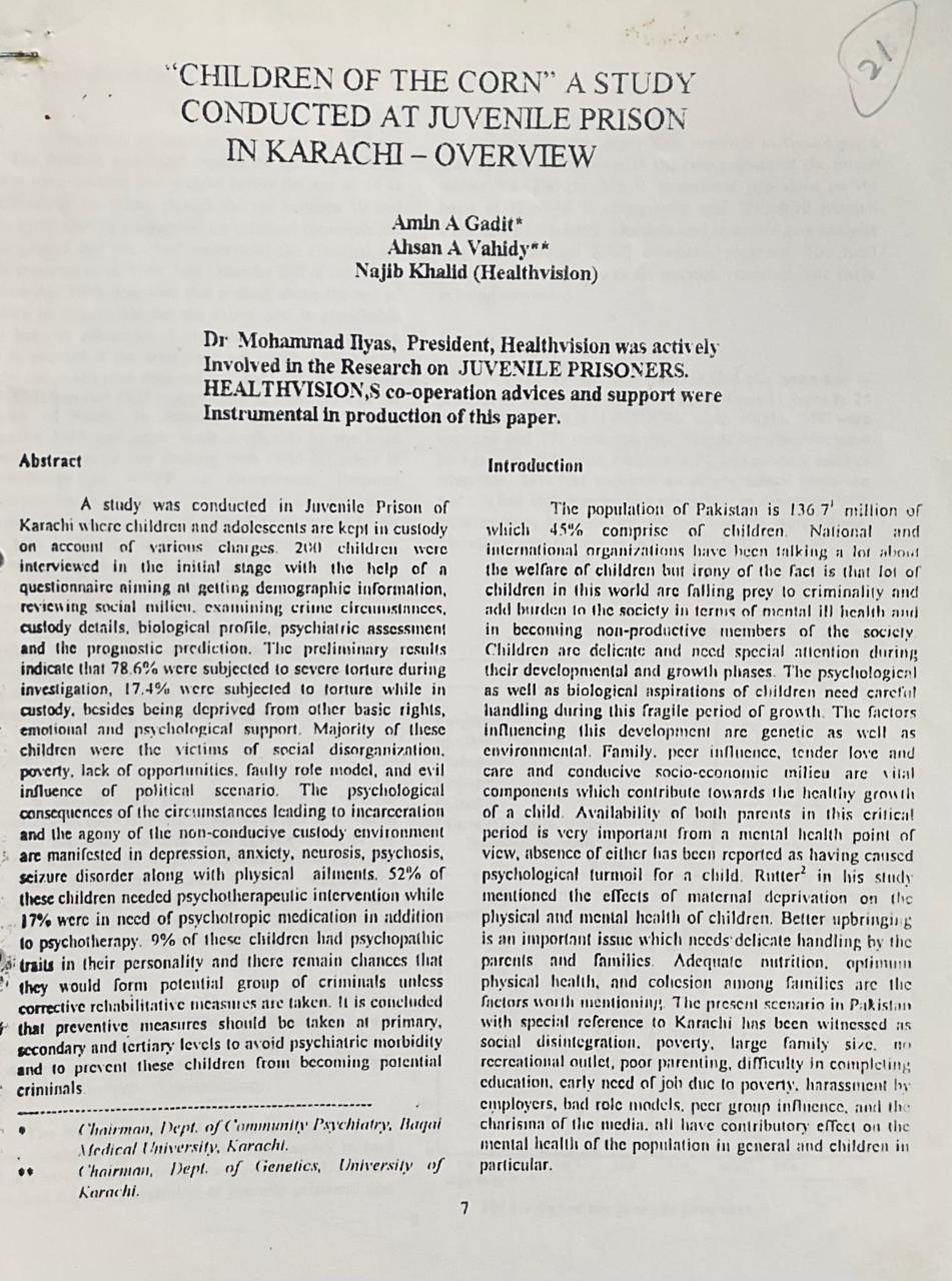 In collaboration with leading psychiatrist, Prof. Amin Gadit, Health Vision co-led a groundbreaking study titled “Children of the Corn” — one of the earliest psychiatric investigations inside Karachi’s juvenile prison.
