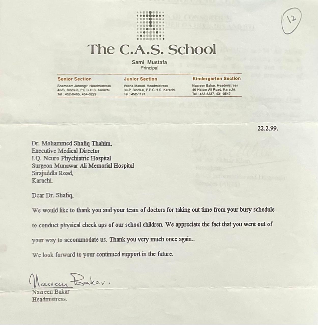 In 1999, the medical teams from IQ and Dr. Aisha’s Health Vision Hospital (then known as Surgeon Munawar Ali Memorial Hospital) extended their care beyond clinical settings, supporting one of Karachi’s leading educational institutions — The C.A.S. School.