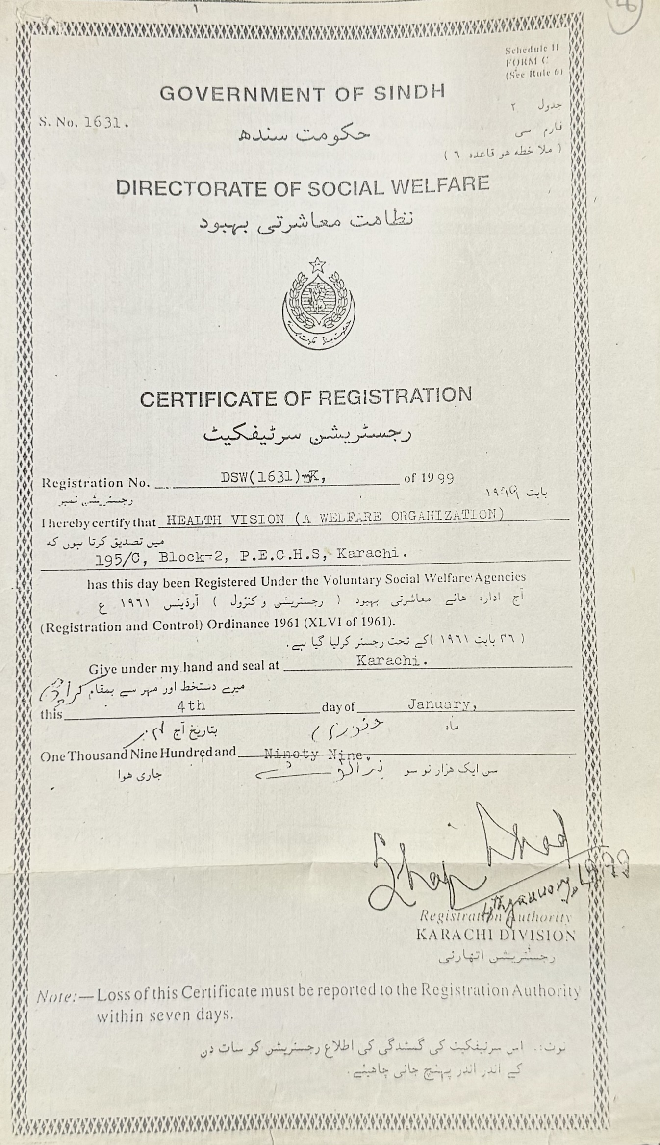 In 1999, Health Vision officially registered as a welfare organization under the Directorate of Social Welfare, Government of Sindh. But our story began long before the paperwork.